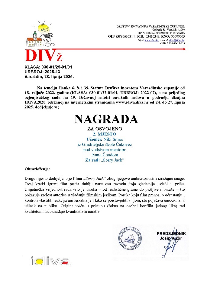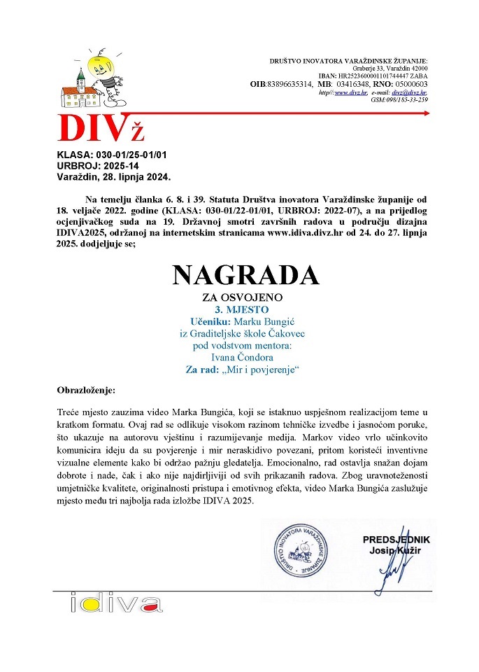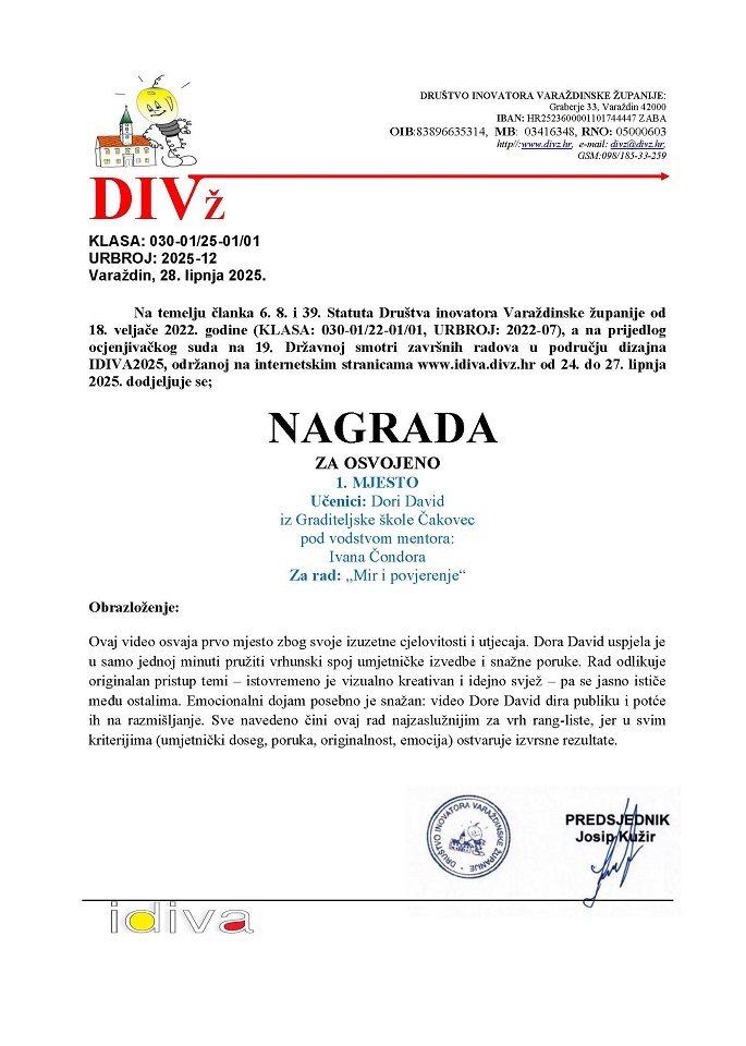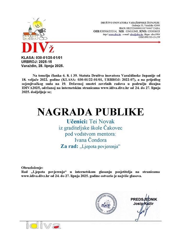 Organizator upućuje zahvalu učenicima, mentorima i školama koje su sudjelovale na izložbi IDIVA 2025, kao i svima koji su glasali za svoje favorite te izražava iskrene čestitke pobjednicima izložbe.